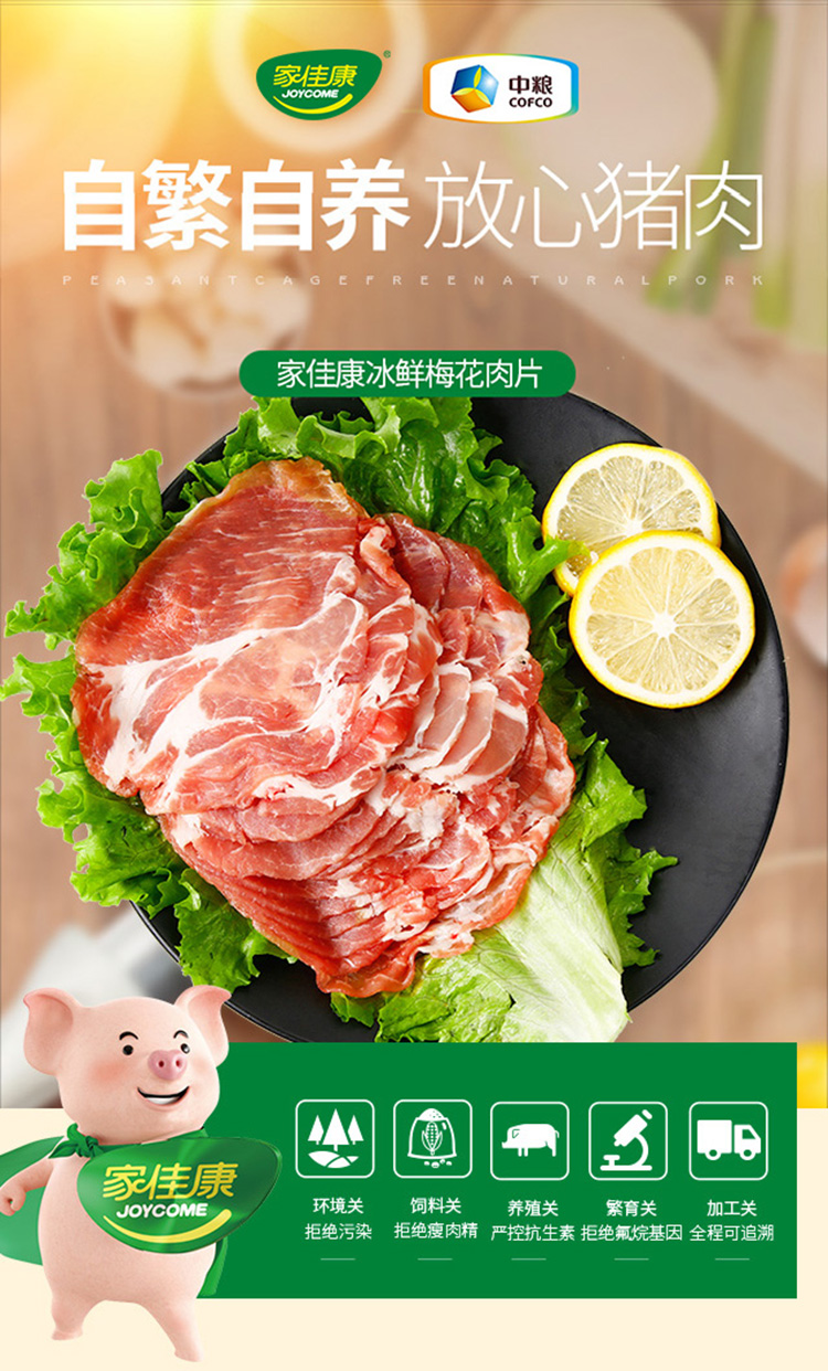 中粮旗下的“家佳康”品牌猪肉生鲜产品,生猪养殖基地为天然养殖环境,把控饲料质量,严控抗生素添加,全程可追溯,其肉质细腻鲜嫩,营养丰富。