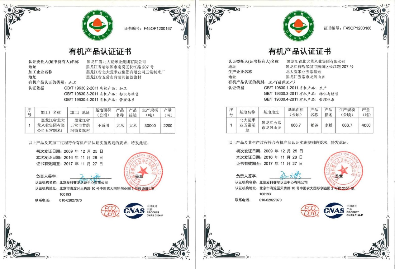 北大荒有机米等同于AA级绿色食品其原产地位于世界仅存的三大黑土带之一——三江平原腹地和国家级自然保护区兴凯湖畔,水稻原料无公害、无污染、安全可靠,种植、加工全过程不使用任何有害物质和化学合成物质,并通过有机产品认证。