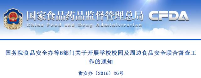 为贯彻国务院领导同志批示要求,督促各地进一步落实国务院食品安全办等6部门《关于进一步加强学校校园及周边食品安全工作的意见》(食安办〔2016〕12号,以下简称《意见》)要求,健全学校校园及周边食品安全管理制度,落实食品安全主体责任,加强食品安全监督管理,保障学生饮食安全,维护社会和谐稳定,国务院食品安全办等6部门决定组织开展学校校园及周边食品安全联合督查。现将有关事项通知如下: