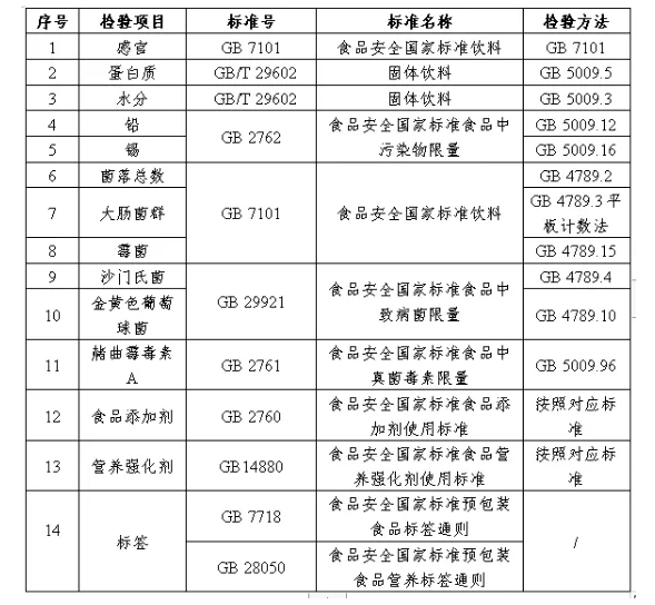 1、按所申报固体饮料的品种(风味固体饮料、蛋白固体饮料、果蔬固体饮料、茶固体饮料、咖啡固体饮料、可可粉固体饮料、其他固体饮料)和执行标准,分别从同一规格、同一批次的试制产品中抽取具有代表性的样品检验。生产其他固体饮料的,按其他固体饮料的具体产品和产品标准加抽样品检验。