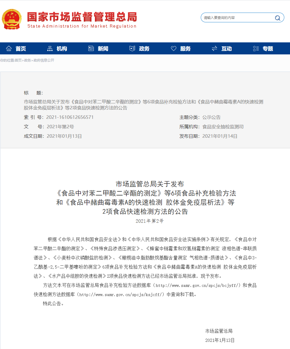 市场监管总局关于发布《食品中对苯二甲酸二辛酯的测定》等6项食品补充检验方法和《食品中赭曲霉毒素A的快速检测 胶体金免疫层析法》等2项食品快速检测方法的公告