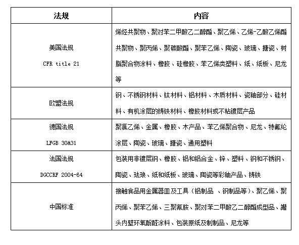 食品包装材料按材料来源分为:塑料(聚乙烯、聚丙烯、聚苯乙烯、三聚氰胺等)、纸与纸板、金属和陶瓷;按包装功能分为:方便包装、展示包装、运输包装和专用包装。食品包装材料与食品直接接触,其中的有害化学物质会迁移进食品,从而会损害人体健康。中国、欧盟和美国等各国都出台相应的法律法规来防止食品接触材料危害消费者健康。